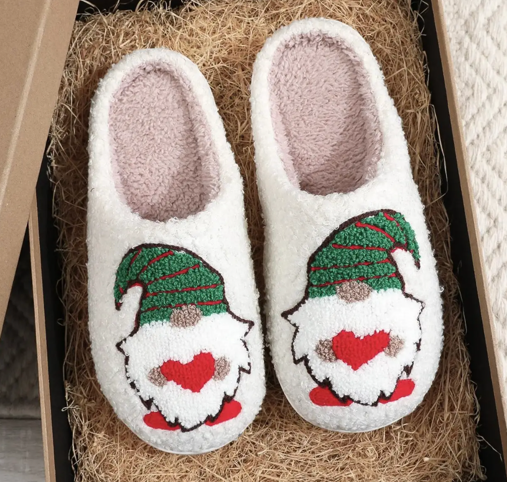 Holiday Gnome Slippers 🎅🏼🎄 Get cozy with these fluffy sherpa slippers featuring a cheerful embroidered gnome in a green hat and red heart details. Lined with soft blush fleece for extra warmth — perfect for lounging through the holidays or gifting with a smile!