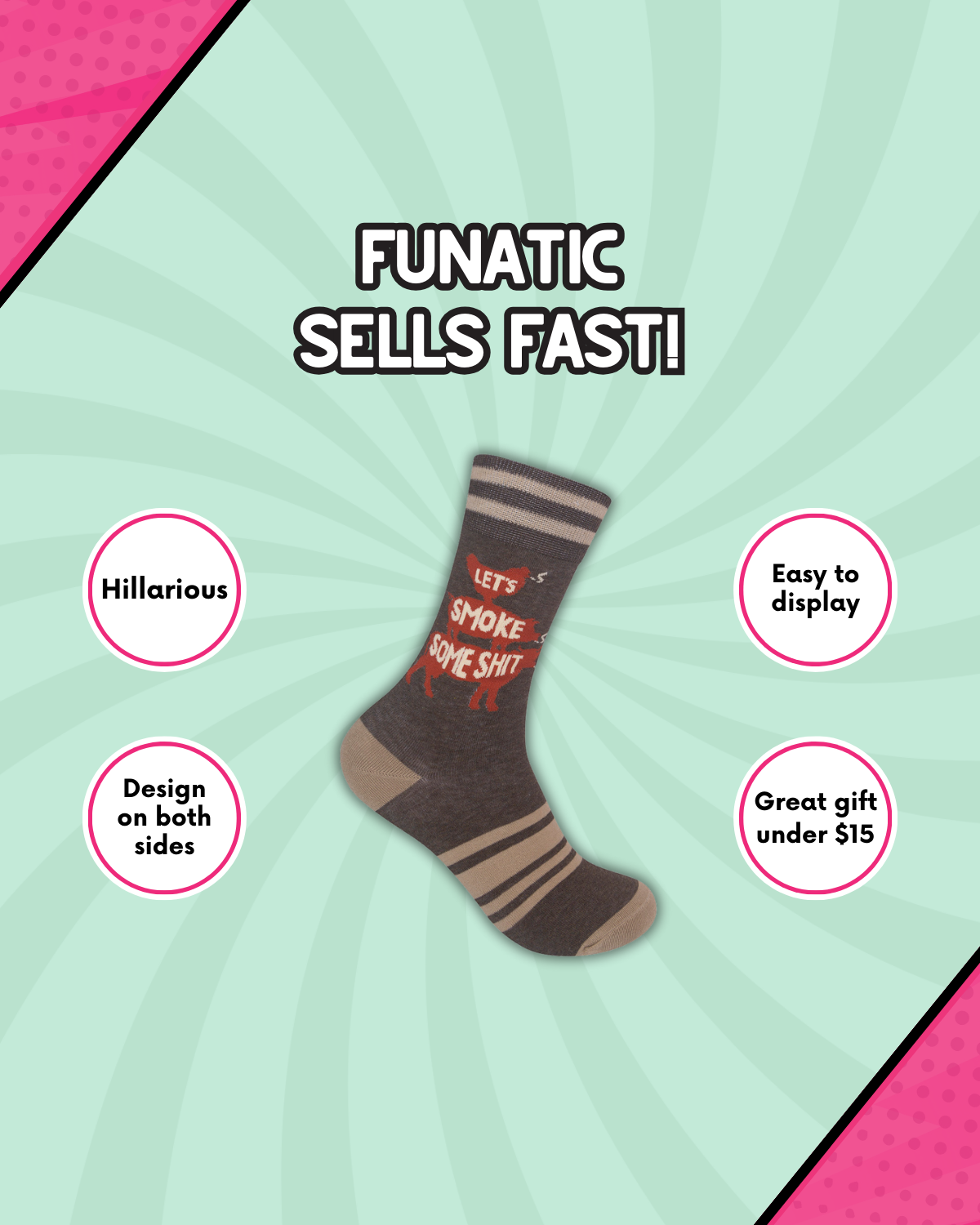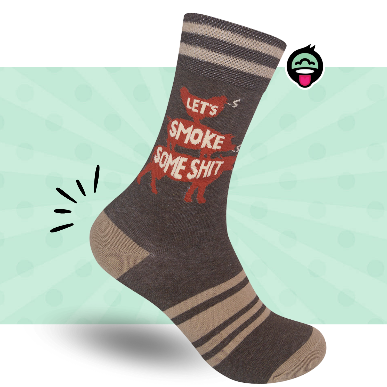 Fire up the grill and your sock game. The Let’s Smoke Some Shit socks are perfect for anyone who believes meat should be cooked low and slow, and jokes should be dry and salty. Perfect for the pitmaster of your own backyard or someone just here for the brisket. These socks really do bring the smoke. They’re brown, bold, and full of flavor (visually speaking). Lighter brown stripes wrap the foot and cuff, while a bright orange stack of a cow, pig, and chicken boldly delivers the message: Let’s Smoke Some Shit. The phrase is cleverly tucked inside the animal’s outlines to make the message clear. Made from a comfy, breathable blend of 70% cotton, 28% polyester, and 2% elastic, these mid-calf crew socks fit most (Men’s 6–11, Women’s 7.5–12). They’re just as good for standing by the smoker all day as they are for kicking back with a beer after you’ve fed the whole neighborhood.